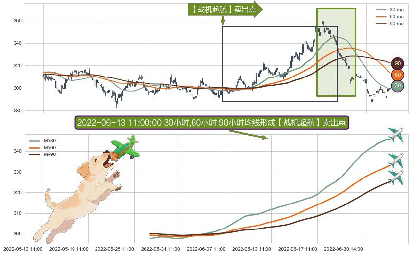形态多维评估: ⚀ 2022-05-26 14:00:00小时-2022-07-08 14:00:00小时显现 30小时-60小时-90小时均线 【战机起航】卖出点 看空信号,后市看跌,卖出
