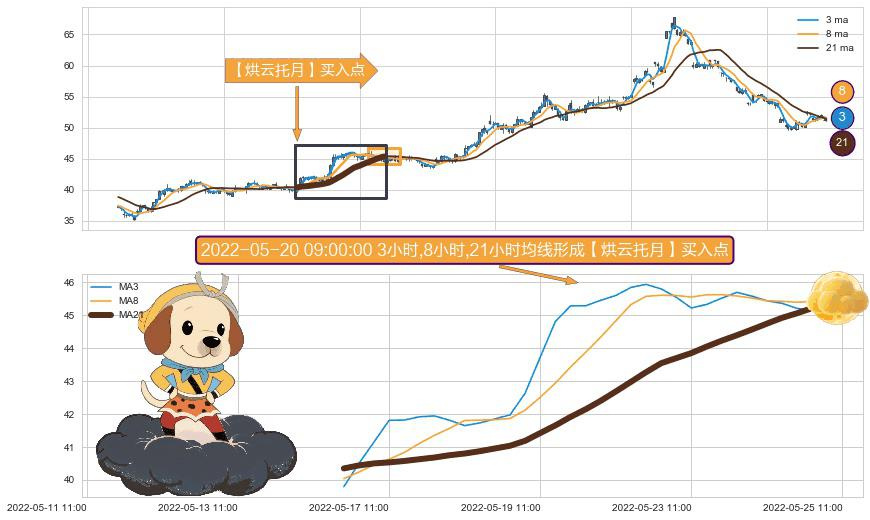 形态多维评估: ⚀ 2022-05-16 14:00:00小时-2022-05-25 10:00:00小时显现 3小时-8小时-21小时均线 【烘云托月】买入点 看多信号,后市看涨,买入