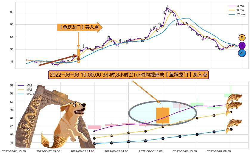 形态多维评估: ⚀ 2022-06-06 10:00:00小时显现 3小时-8小时-21小时均线 【鱼跃龙门】买入点 看多信号,后市看涨,买入