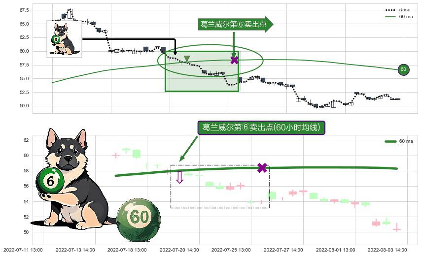 形态多维评估: ⚀ 2022-07-19 14:00:00-小时显现 葛兰威尔均线 60小时均线 第⑥卖出点 走势反转见顶信号,后市看跌,卖出信号