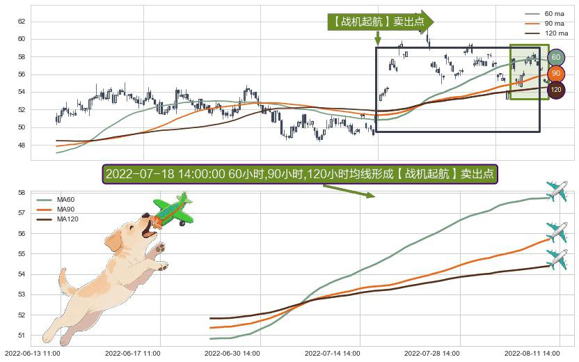 ⚀ 2022-06-23 14:00:00小时-2022-08-10 14:00:00小时显现 60小时-90小时-120小时均线 【战机起航】卖出点 看空信号,后市看跌,卖出