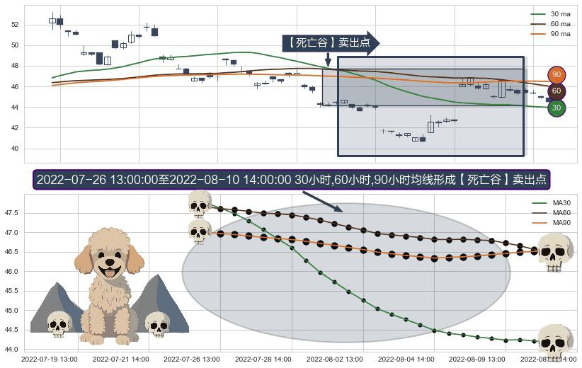 ⚀ 2022-07-26 14:00:00-小时至2022-08-10 14:00:00-小时显现 30小时-60小时-90小时均线 【死亡谷】卖出点 看空信号,后市看跌,卖出