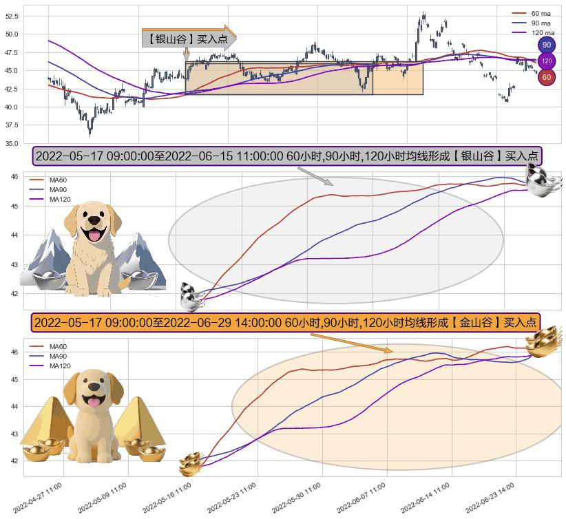 ⚃ 2022-05-17 10:00:00-小时至2022-06-29 14:00:00-小时显现 60小时-90小时-120小时均线 【金山谷】买入点 其再次确认了买入信号,可靠性更强,买入