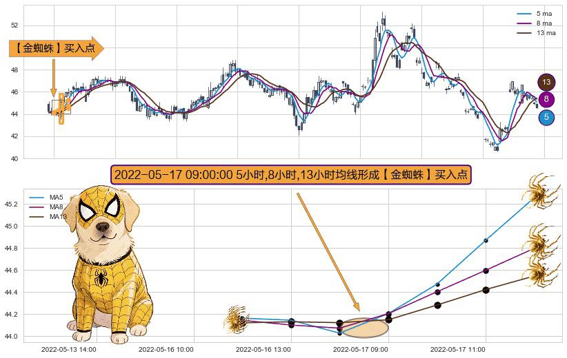 ⚀ 2022-05-17 09:00:00小时显现 5小时-8小时-13小时均线 【金蜘蛛】买入点 看多信号,后市看涨,买入