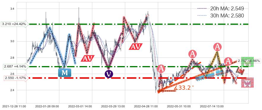♘ 阻力价格位2.687,可信任强度70.44%,距离最后交易2022-08-12 14:00形成的收盘价格2.580相差 +4.14%