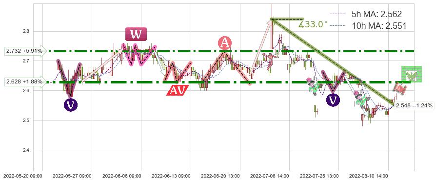 ♘ 阻力价格位2.628,可信任强度90.01%,距离最后交易2022-08-12 14:00形成的收盘价格2.580相差 +1.88%