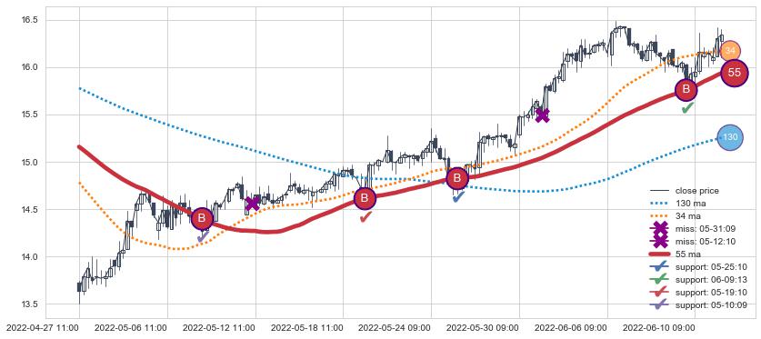 ⚁ MA3和MA8走势平行,且始终保持在短距离内,MA21始终在短中期均线下方,与短中期均线保持一定的距离,微微上行