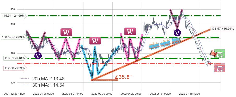 ♞ 20小时均线:113.48,30小时均线:114.54→ 快线<慢线