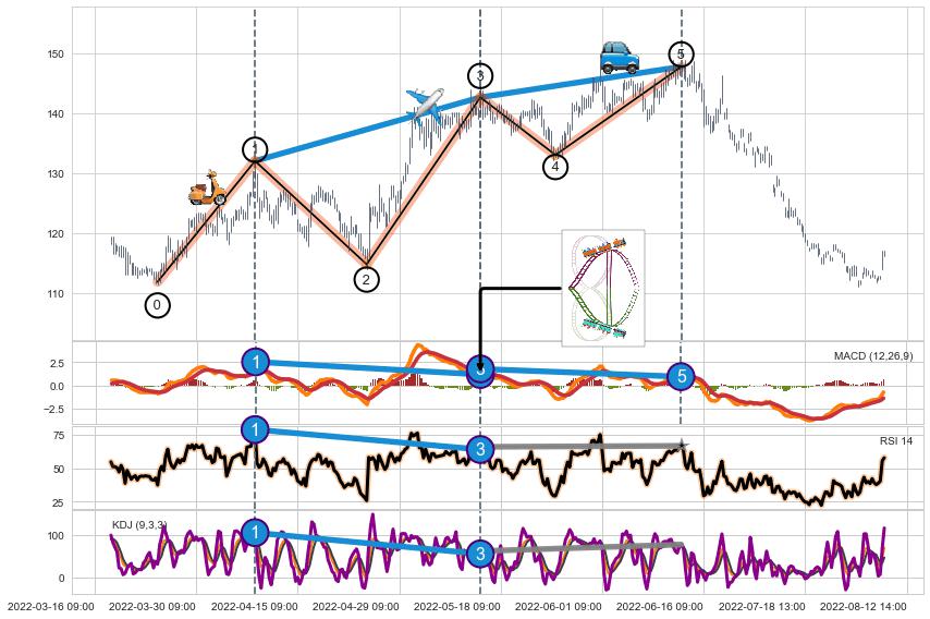 ➣ 1,3,5驱动浪MACD, RSI, KDJ走势都出现【常规背离】反转信号增强