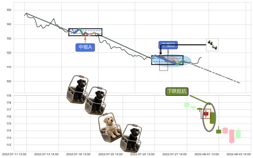 ➣ 【中枢B】:07-26:13-08-05:14,中枢由4笔构成,共18交易小时, ZG=115.75, ZD=114.40