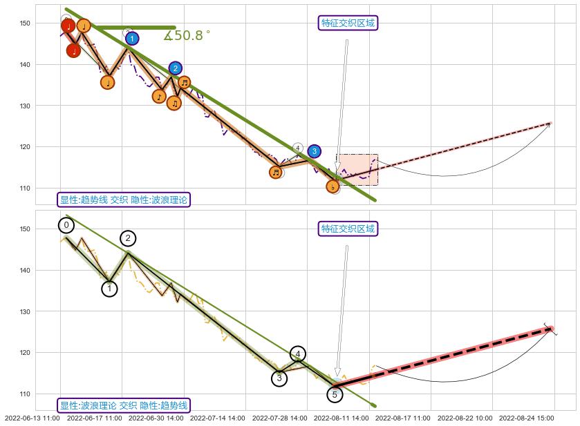 从2022-06-14 11:00至2022-08-12 13:00,共包含97个小时,阶段股价下跌-21.34%,阶段股价变动位移路程比: 1 : 4,下跌趋势角度: 50.1