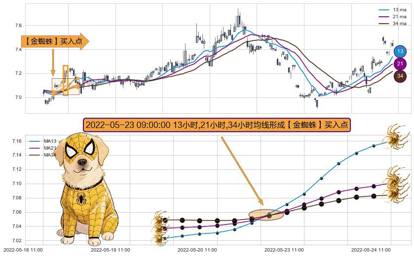 形态多维评估: ⚀ 2022-05-23 09:00:00小时显现 13小时-21小时-34小时均线 【金蜘蛛】买入点 看多信号,后市看涨,买入