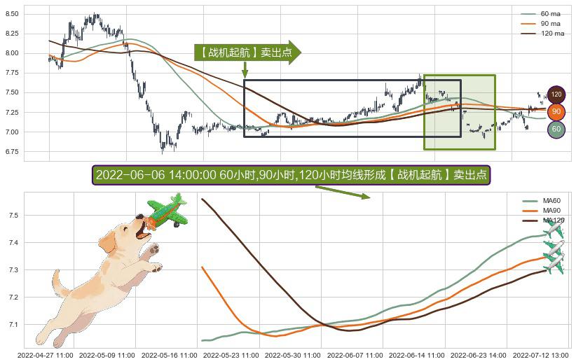 形态多维评估: ⚀ 2022-05-16 14:00:00小时-2022-07-05 14:00:00小时显现 60小时-90小时-120小时均线 【战机起航】卖出点 看空信号,后市看跌,卖出