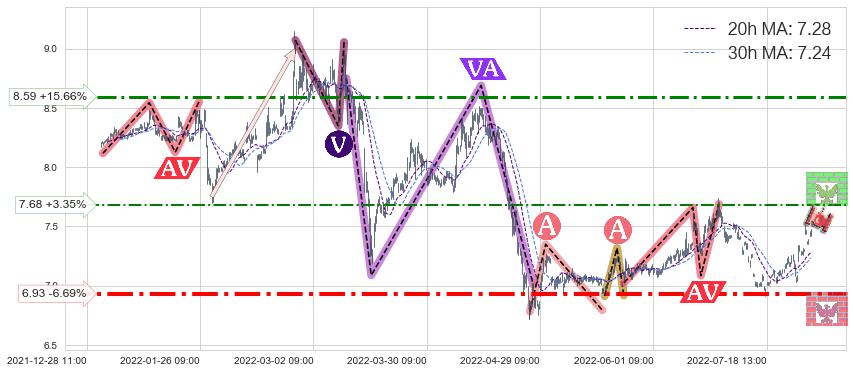 ♘ 阻力价格位7.68,可信任强度48.42%,距离最后交易2022-08-12 14:00形成的收盘价格7.43相差 +3.35%
