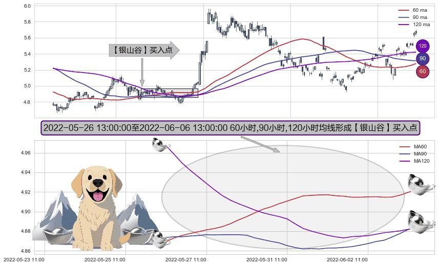 形态多维评估: ⚀ 2022-05-26 14:00:00-小时至2022-06-06 13:00:00-小时显现 60小时-90小时-120小时均线 【银山谷】买入点 看多信号,后市看涨,买入