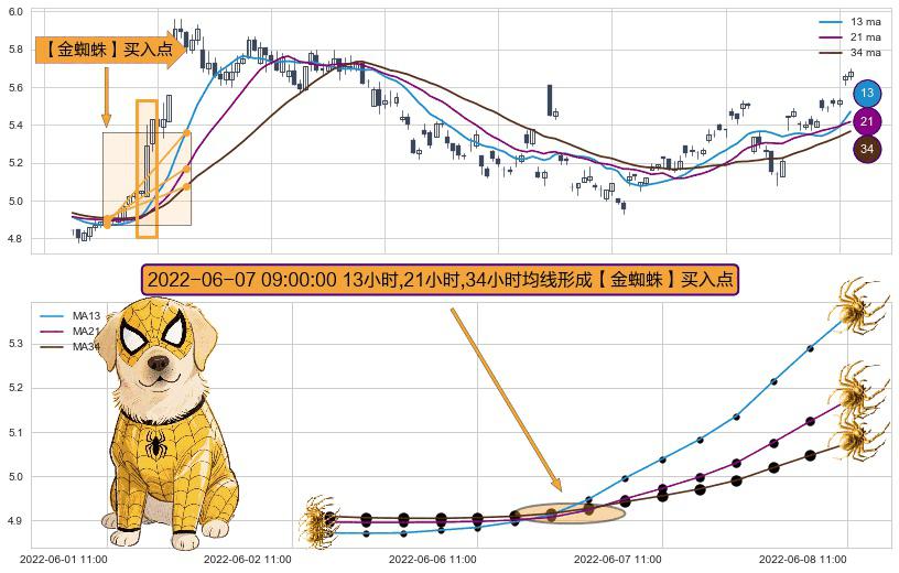 形态多维评估: ⚀ 2022-06-07 09:00:00小时显现 13小时-21小时-34小时均线 【金蜘蛛】买入点 看多信号,后市看涨,买入