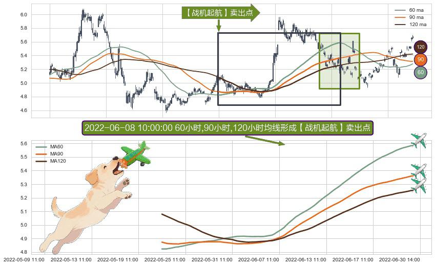 形态多维评估: ⚀ 2022-05-23 11:00:00小时-2022-06-29 13:00:00小时显现 60小时-90小时-120小时均线 【战机起航】卖出点 看空信号,后市看跌,卖出