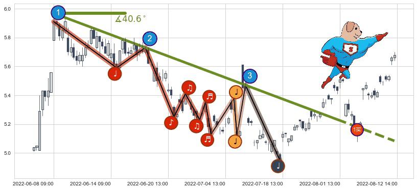 ⚔️ 2022-06-08 09:00-2022-07-29 14:00下跌趋势存在反转上涨[机会],其原下跌趋势的阻力位(5.08)已被突破[强支撑信号],原下跌趋势角度: 40.6˚