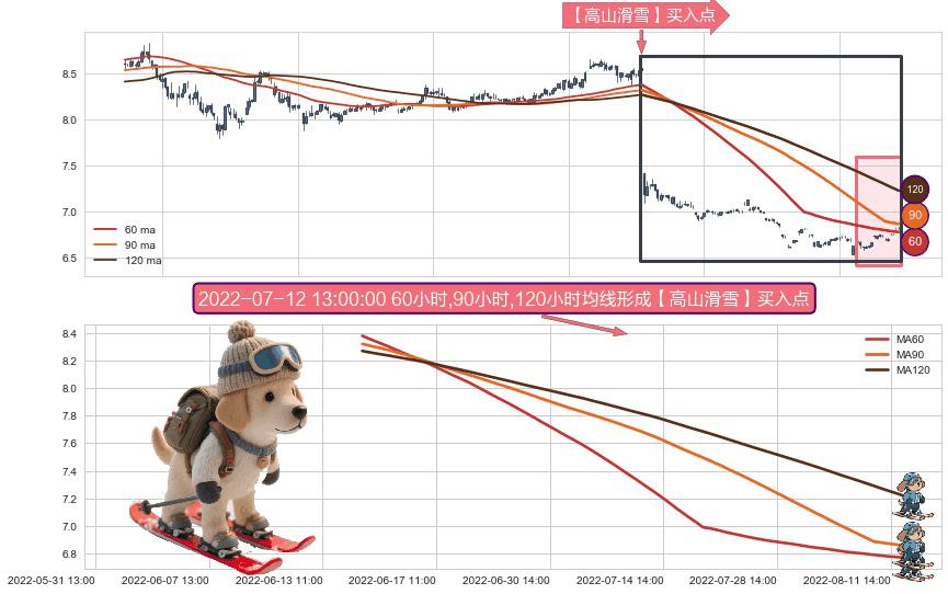 ⚀ 2022-06-14 14:00:00小时-2022-08-12 14:00:00小时显现 60小时-90小时-120小时均线 【高山滑雪】买入点 看多信号,后市看涨,买入