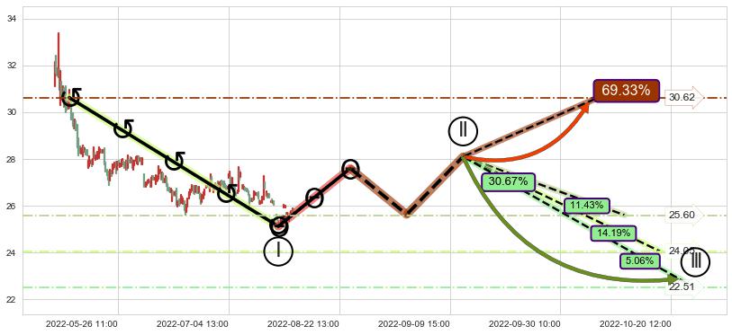 ➢ 循环浪继续向下【最低】位置(10-25:12, 22.51),匹配聚类样本比例16.48%, 可能性概率5.06%