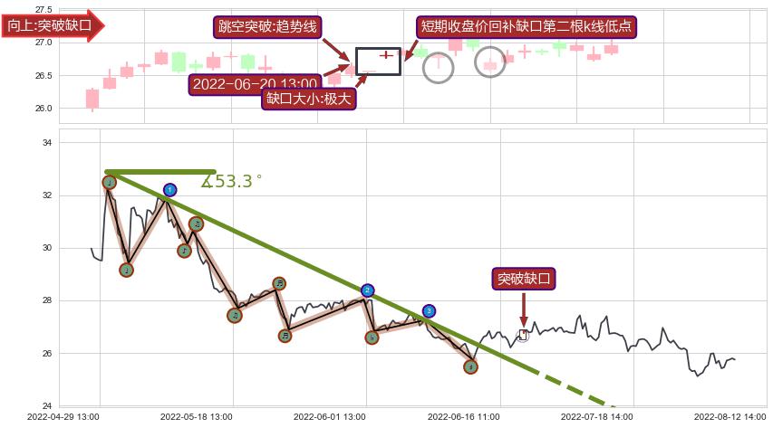 ➣ 2022-05-05 10:00-2022-06-20 13:00下跌趋势存在反转上涨[机会],其原下跌趋势的阻力位(21.75)已被突破[强支撑信号],原下跌趋势角度: 53.3˚