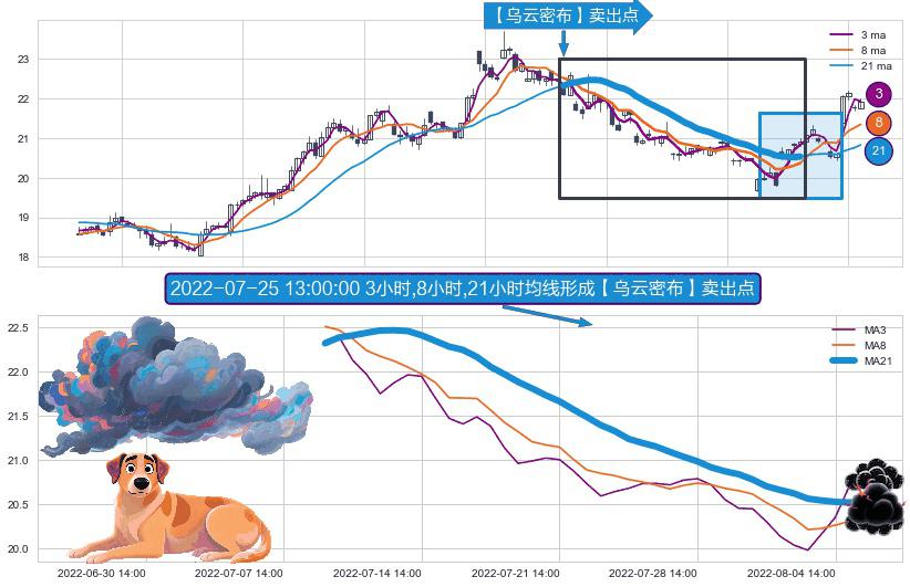 ⚀ 2022-07-11 13:00:00小时-2022-08-05 14:00:00小时显现 3小时-8小时-21小时均线 【乌云密布】卖出点 看空信号,后市看跌,卖出