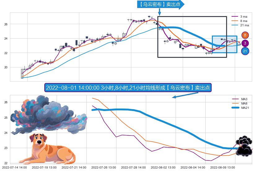 形态多维评估: ⚀ 2022-07-22 13:00:00小时-2022-08-09 14:00:00小时显现 3小时-8小时-21小时均线 【乌云密布】卖出点 看空信号,后市看跌,卖出