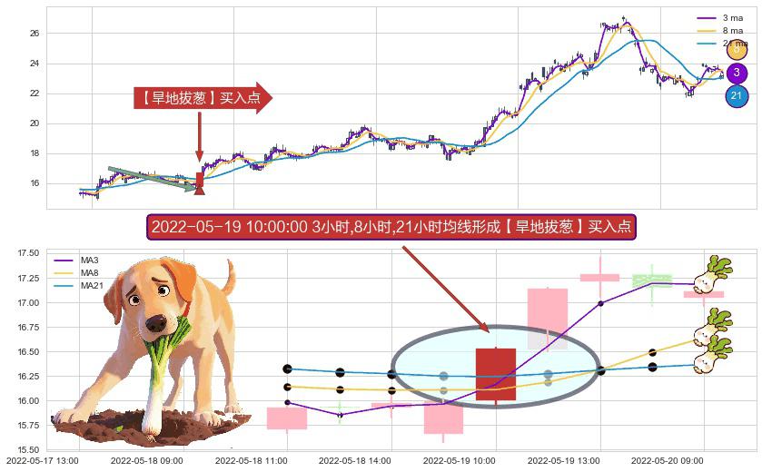 形态多维评估: ⚀ 2022-05-19 10:00:00小时显现 3小时-8小时-21小时均线 【旱地拔葱】买入点 看多信号,后市看涨,买入