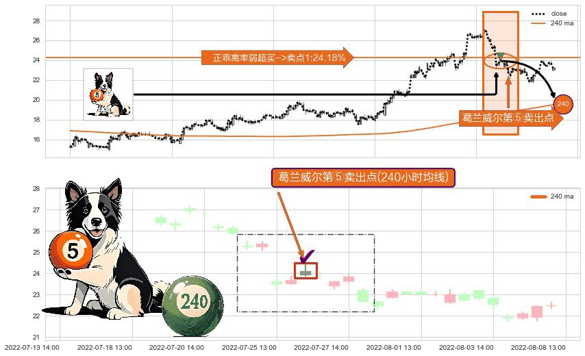 形态多维评估: ⚀ 2022-07-26 13:00:00-小时显现 葛兰威尔均线 240小时均线 第⑤卖出点 上升趋势均值回复的短线回落信号,后市看跌,卖出信号
