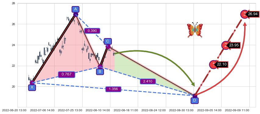 ➢ 未完成【蝴蝶】形态起点X: 06-22:14, 已到达C点: 08-09:14, 预测最终D点: 08-30:14, 共147交易小时