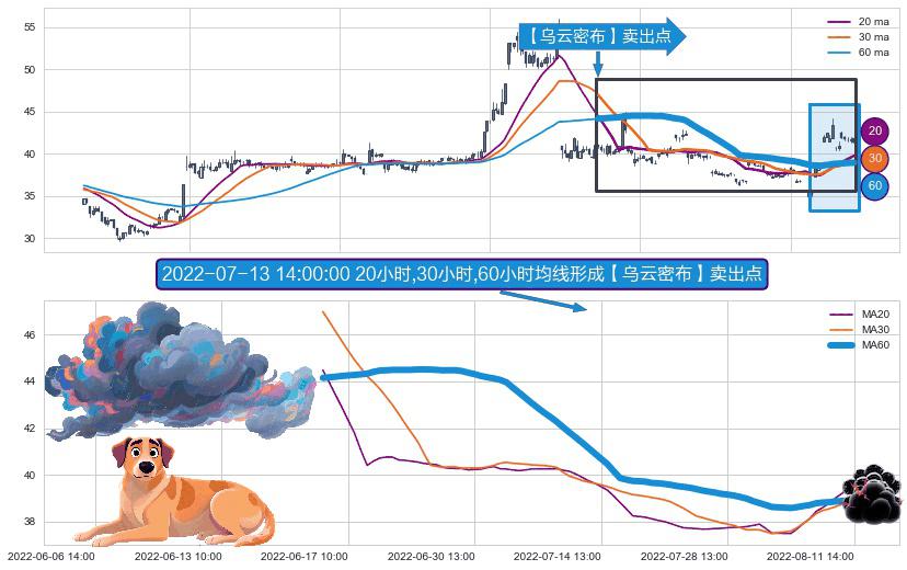 形态多维评估: ⚀ 2022-06-16 11:00:00小时-2022-08-12 13:00:00小时显现 20小时-30小时-60小时均线 【乌云密布】卖出点 看空信号,后市看跌,卖出