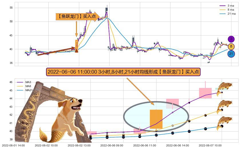 形态多维评估: ⚀ 2022-06-06 11:00:00小时显现 3小时-8小时-21小时均线 【鱼跃龙门】买入点 看多信号,后市看涨,买入