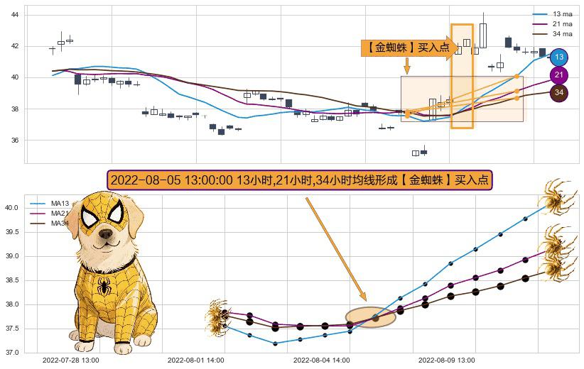 形态多维评估: ⚀ 2022-08-05 13:00:00小时显现 13小时-21小时-34小时均线 【金蜘蛛】买入点 看多信号,后市看涨,买入