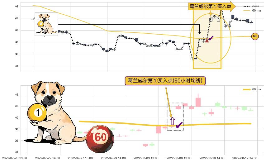 形态多维评估: ⚀ 2022-08-04 14:00:00-小时显现 葛兰威尔均线 60小时均线 第买①入点 走势反转见底信号,后市看涨,买进信号
