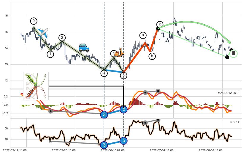 ➣ 第一, 三, 五浪下跌动能逐渐【衰弱变小】,趋势呈现不稳迹象
