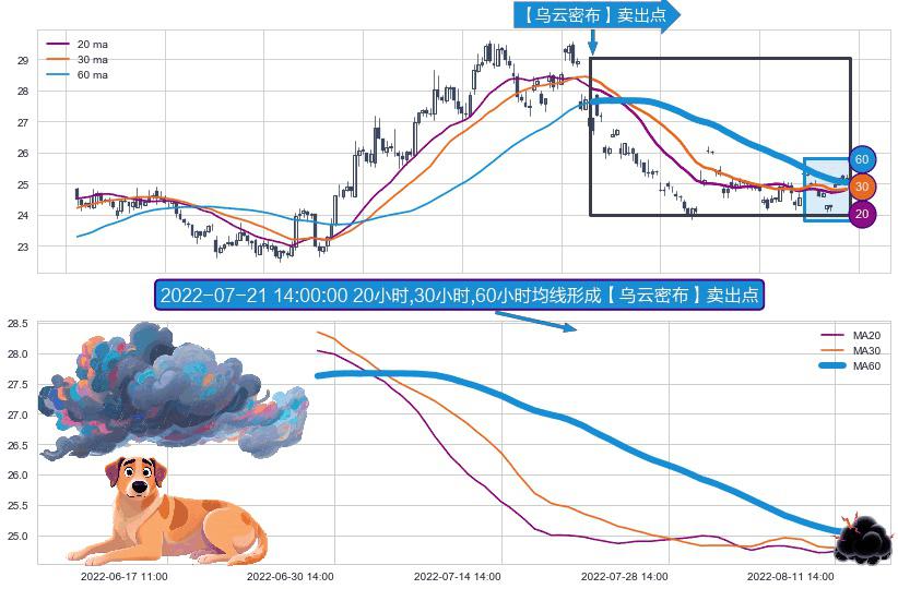 ⚀ 2022-06-29 14:00:00小时-2022-08-12 14:00:00小时显现 20小时-30小时-60小时均线 【乌云密布】卖出点 看空信号,后市看跌,卖出