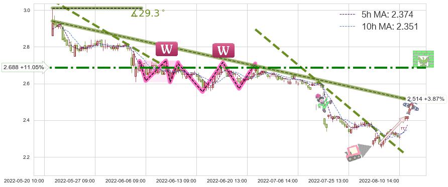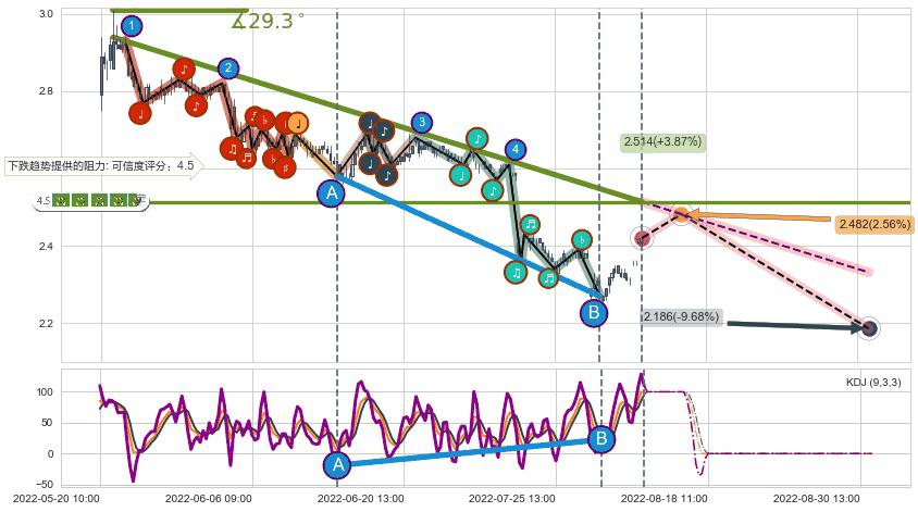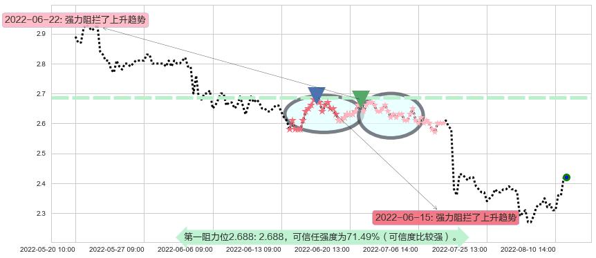 ♘ 阻力价格位2.688,可信任强度71.49%,距离最后交易2022-08-12 14:00形成的收盘价格2.420相差 +11.05%