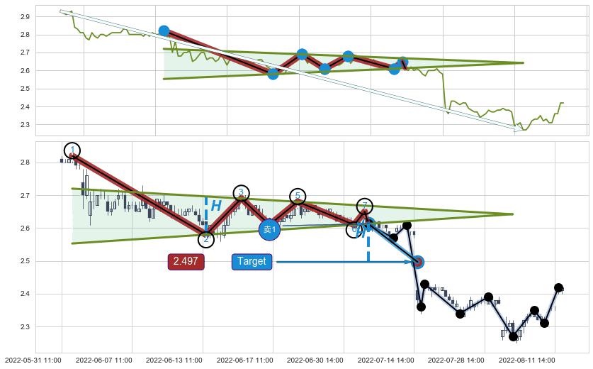 ➢ 最小中继整理跌幅→𝐇: 0.116250 (低点逐步抬高斜边第一支撑点②与阻力边垂直距离)
