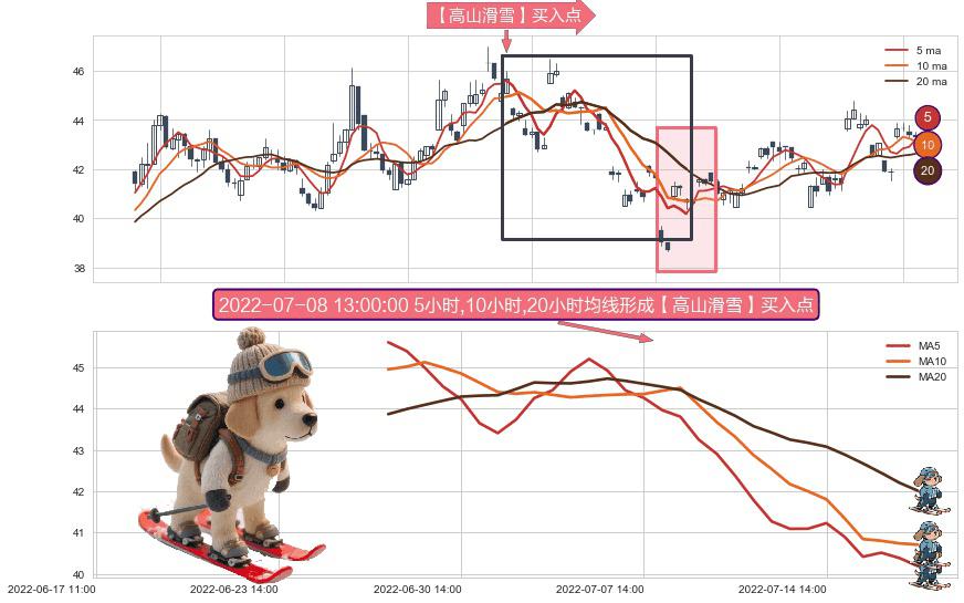 形态多维评估: ⚀ 2022-06-28 14:00:00小时-2022-07-19 13:00:00小时显现 5小时-10小时-20小时均线 【高山滑雪】买入点 看多信号,后市看涨,买入