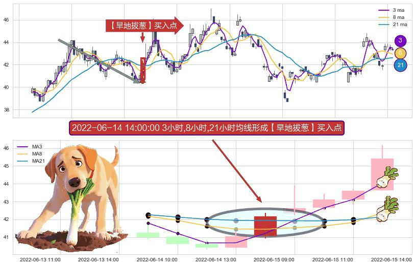 形态多维评估: ⚀ 2022-06-14 14:00:00小时显现 3小时-8小时-21小时均线 【旱地拔葱】买入点 看多信号,后市看涨,买入