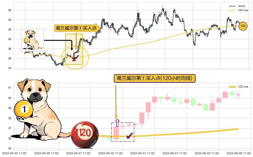 形态多维评估: ⚀ 2022-05-30 10:00:00-小时显现 葛兰威尔均线 120小时均线 第买①入点 走势反转见底信号,后市看涨,买进信号