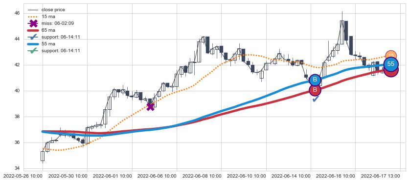 上涨趋势04-28 11:00-05-13 11:00,均线15, 55确认关键支撑2处