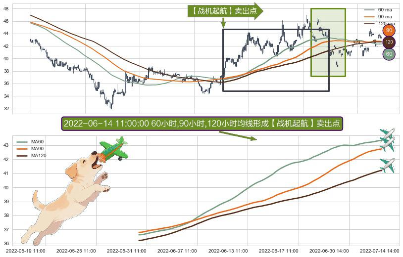 形态多维评估: ⚀ 2022-05-30 14:00:00小时-2022-07-11 13:00:00小时显现 60小时-90小时-120小时均线 【战机起航】卖出点 看空信号,后市看跌,卖出