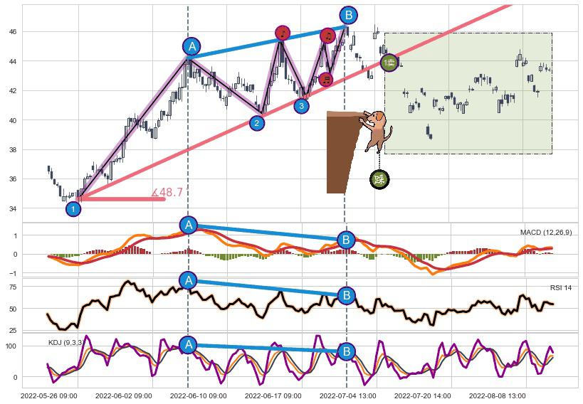 从2022-05-26 09:00至2022-06-30 14:00,共包含98个小时,阶段股价上涨24.29%,阶段股价变动位移路程比: 1 : 5,上涨趋势角度: 48.7