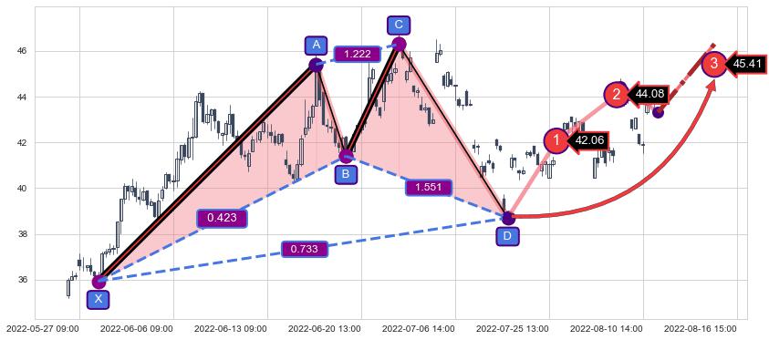 ➣ D点拟合预测价格41.28,距离最后交易收盘价格43.32相差 -4.72%
