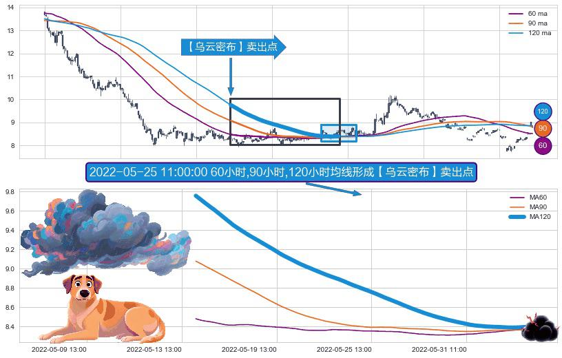 ⚀ 2022-05-16 10:00:00小时-2022-06-06 10:00:00小时显现 60小时-90小时-120小时均线 【乌云密布】卖出点 看空信号,后市看跌,卖出