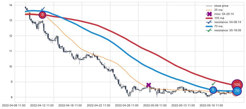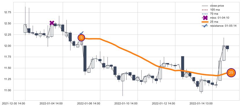 ⚄ 价格在均线遇到阻力后再次向下回落了【极短】距离, 第⑦卖出点 阻力效果【等待验证】