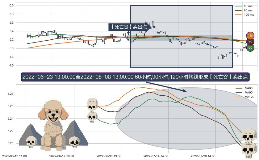 形态多维评估: ⚀ 2022-06-23 14:00:00-小时至2022-08-08 13:00:00-小时显现 60小时-90小时-120小时均线 【死亡谷】卖出点 看空信号,后市看跌,卖出