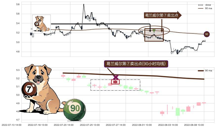 形态多维评估: ⚀ 2022-07-26 14:00:00-小时显现 葛兰威尔均线 90小时均线 第⑦卖出点 下降趋势的中继信号,后市看跌,卖出信号