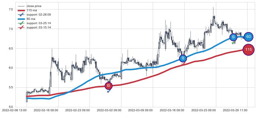 上涨趋势02-08 13:00-03-29 11:00,均线115, 60确认关键支撑3处